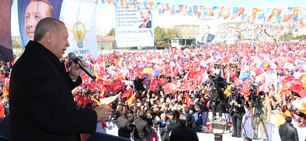 Cumhurbaşkanımız Erdoğan, "31 Mart’ta, iftiracı müptezellere edep dersi, ahlak dersi, insanlık dersi vermeye hazırlanan bir Elazığ var. 31 Mart’ta, dörtlü yalan çetesine dürüstlük dersi vermeye can atan gakkoşlar var. 31 Mart’ta Kandil’in mızıkacılarına sandıkta milli şamarı indirmeyi iple çeken bir El Aziz var. Bu meydanda yalan yok, bu meydanda iftira yok, bu meydanda sadece aşk var, samimiyet var. Bu meydanda hakaret, bühtan yok sadece dürüstlük, nezaket var. Bu meydanda zillet yok sadece beka var, bağımsızlık, milli gurur var. Bu meydanda gerektiğinde bölücüleri demir yumruk olup ezen yiğitler var. Bu meydanda kutuplaşma değil, sadece kardeşlik var. Rabbim bu meydanı, bu sevdayı kem gözlerden nazarlardan saklasın. Rabbim yol arkadaşlığımızı, dayanışmamızı daim eylesin. Dostluğunuz, muhabbetiniz için her birinize teşekkür ediyorum." diye konuştu.
