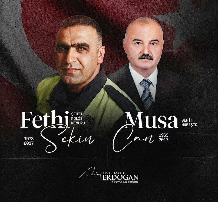 Cumhurbaşkanımız Erdoğan, NSosyal hesabından yaptığı paylaşımda, "İzmir'de teröristlere karşı kahramanca mücadele ederken şehit olan polis memurumuz Fethi Sekin ile adliye personeli Musa Can kardeşimizi şehadetlerinin 9'uncu yılında rahmetle, minnetle yad ediyorum." ifadelerini kullandı.
