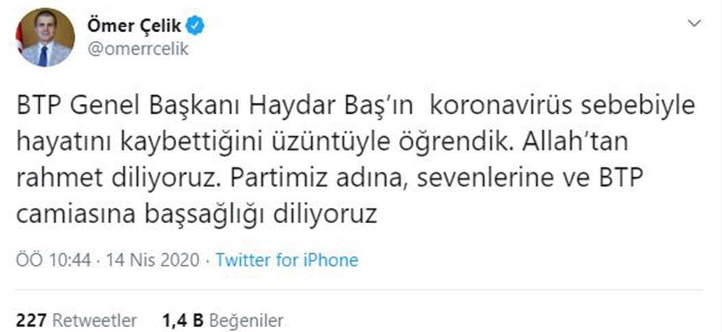Çelik, Twitter hesabından, yeni tip koronavirüs (Kovid-19) şüphesiyle tedavi gördüğü hastanede vefat eden Haydar Baş için taziye mesajı paylaştı.