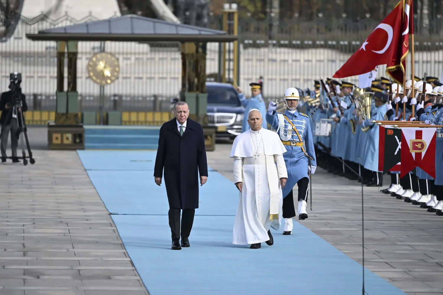 Once President Erdoğan and Pope Leo XIV arrived at the ceremonial ground, the national anthem of Türkiye and the anthem of the State of Vatican City were played, and Pope Leo XIV inspected the guard of honor.