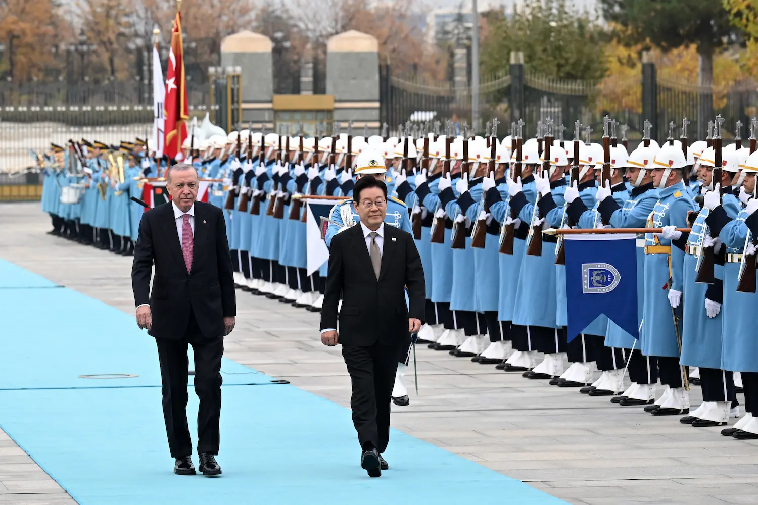 Once the two leaders arrived at the ceremonial ground, the national anthems of Türkiye and the Republic of Korea were played, and President Lee inspected the guard of honor.