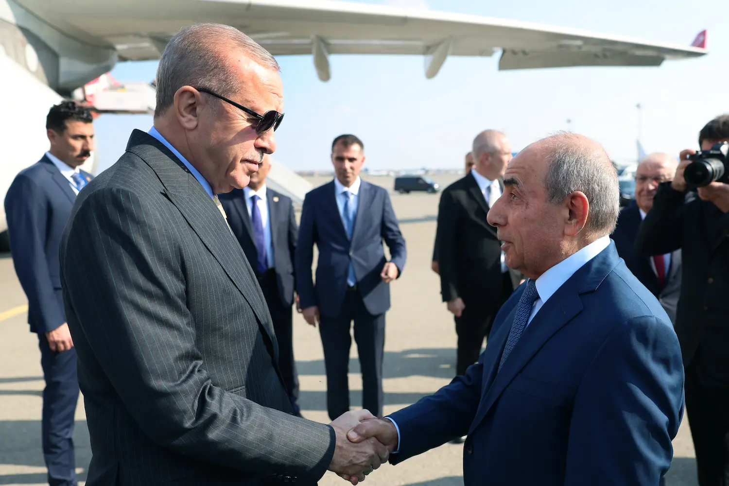 President Erdoğan was welcomed at Heydar Aliyev International Airport by First Deputy Prime Minister of Azerbaijan Yagub Eyyubov, Deputy Minister of Foreign Affairs of Azerbaijan Samir Sharifov, Minister of National Defense Yaşar Güler, Azerbaijan’s Ambassador to Ankara Reşad Memmedov and Türkiye’s Ambassador to Baku Birol Akgün.