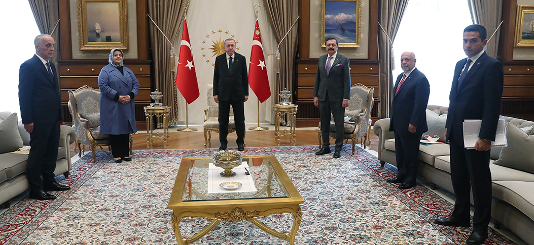 Cumhurbaşkanlığı Külliyesi’ndeki kabulde, Bakan Selçuk ile beraberinde TOBB Başkanı Rifat Hisarcıklıoğlu, TİSK Başkanı Özgür Burak Akkol, Türk-İş Başkanı Ergün Atalay ve Hak-İş Başkanı Mahmut Arslan yer aldı.