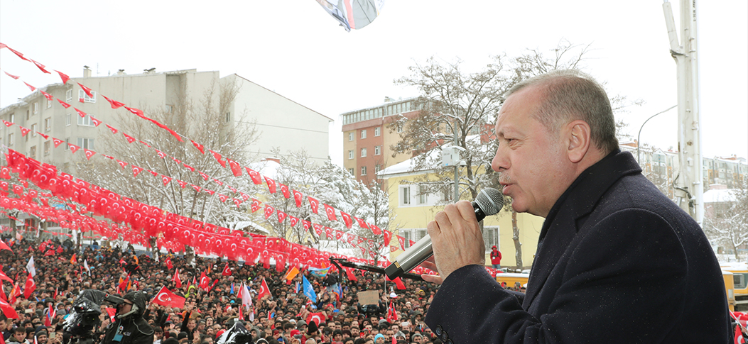 Erdoğan, "Erzurum, 31 Mart’ta bir kez daha hizmet siyasetini tercih ediyor muyuz? Erzurum, 31 Mart’ta ’Memleket işi gönül işi’ diyen kadrolarla yola devam ediyor muyuz? Erzurum, 31 Mart’ta tercihimizi bir kez daha istikrar ve güvenden yana kullanıyor muyuz? Erzurum, 31 Mart’ta Cumhur İttifakı ile yola devam diyor muyuz?" sorularına, "Evet" yanıtını aldı.