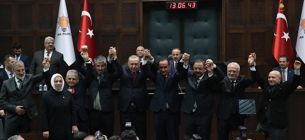 İl Başkanlığından yapılan yazılı açıklamaya göre, Cumhurbaşkanımız Erdoğan grup toplantısı sonunda, partimize geçen 5 belediye başkanı için düzenlenen katılım töreninde başkanlara rozet taktı.
