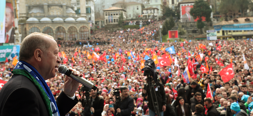 Vatandaşlara "Rabia çok önemli, öyle bir haykıralım ki tüm Türkiye duysun." diyen ve vatandaşlarla birlikte, "Tek millet, tek bayrak, tek vatan, tek devlet. Bir olacağız, iri olacağız, diri olacağız, kardeş olacağız, hep birlikte Türkiye olacağız." ifadelerini tekrarlayan Erdoğan, "Duymayanlar duysun, duyanların yürekleri oynasın. Cumhur İttifakı’nın karşısına bir yanda Feto’yu, bir yanda PKK’yı alıp önüne birkaç parti katanlara 31 Mart’ta derslerini veriyor muyuz? İşte benim Rize’m budur." diye konuştu.